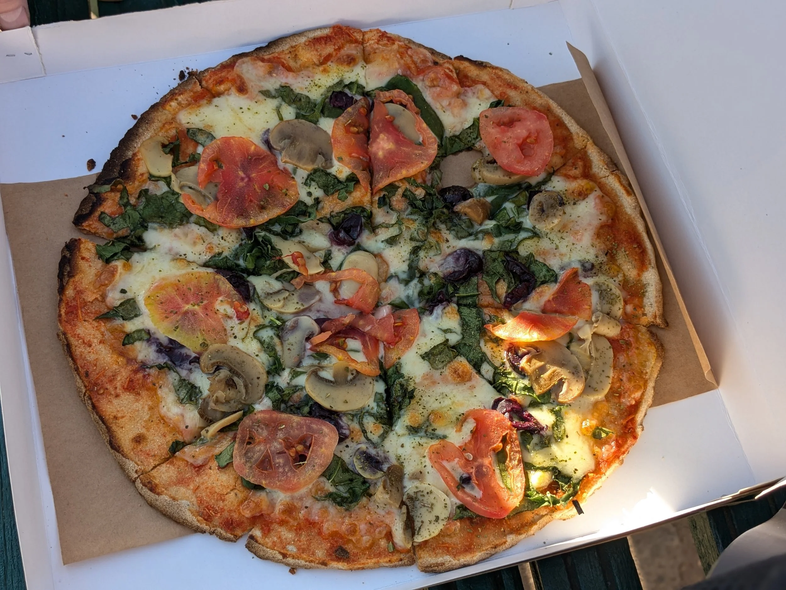 Second time gluten-free pizza Chosa — again eating on the bench outside.