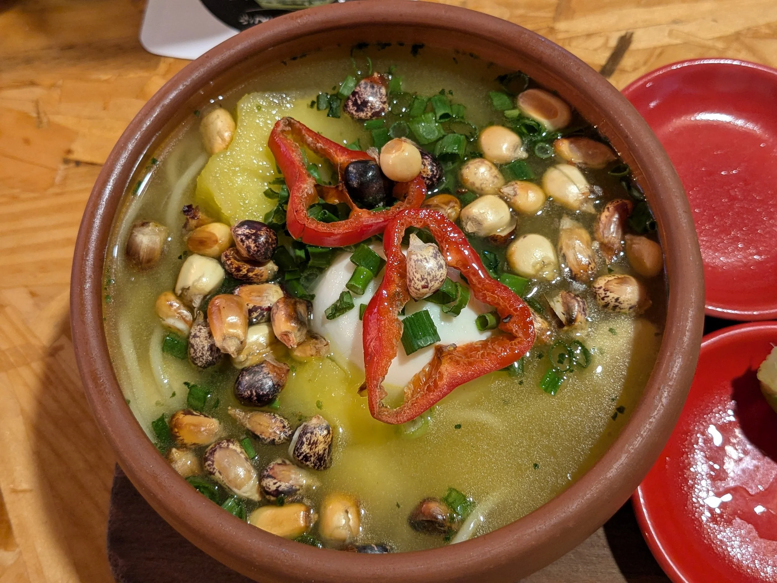 The appetizer was an experience in itself. We visited the restaurant when it was the first of August. In Andean culture, this day marks the beginning of the 'Andean New Year' for Pachamama, a sacred time when Mother Earth is believed to be most 'hungry' after months of giving. To honor her, people offer rituals and ceremonies, often involving the lighting of charcoal or fire — seen as a sacred, purifying element that helps carry offerings to the Earth goddess. After this ritual had taken place our appetizers were served. Arnoud had “Caldo de pollo criollo – Peruvian chicken broth, noodles, egg and ginger with chives, lemon and toasted corn” (NOT gluten-free) and I had “ Experienca de uchucuta en piedra – Ancestral Andean chili sauce made in stone, served with potato native chips from our seed guardians.” Surprisingly the uchucuta, is traditionally prepared without allium! Which is uncommon. The sauce consists of salt, Andean cheese, chillies, corn kernels, water, three different tomato paste, plus huacatay leaves and is prepared at the table in front of you with a mortar. In several steps the ingredients are added and grounded to a sauce whilst the waiter tells all about the preparation and traditions of the dish and their ancestors!