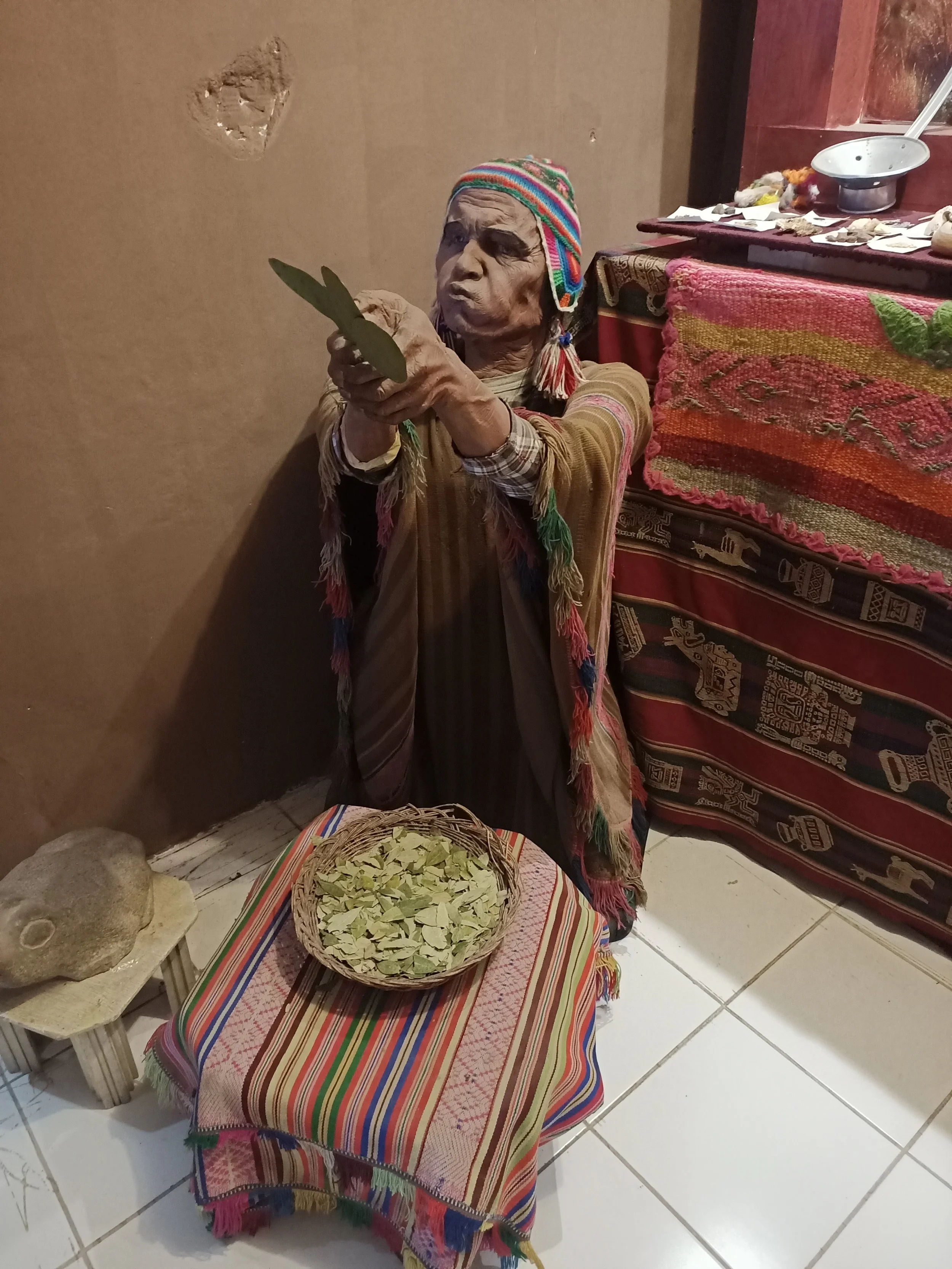 Most of the statues are depicted with a ball in their cheek, indicating that they are chewing coca leaves. You can also see coca leaves in the basket—similar to the ones used to make the tea.