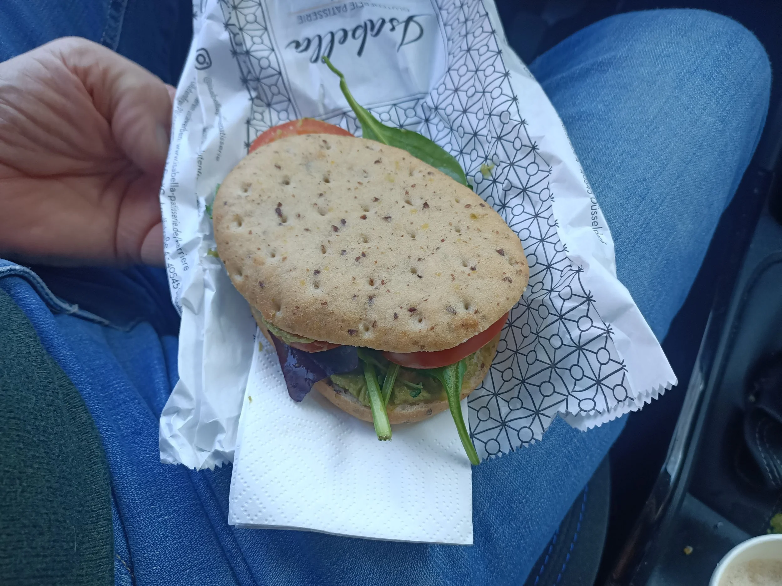It was nice and sunny but we took the order to the car. To me, it was still too chilly to sit outside. We both enjoyed this lunch a lot. My father liked to joke about the weight of the croissants, but when you actually eat them they feel much lighter to digest than the buttery gluten croissants. I ordered from the menu in German: eine Tee aus Orange, frischer Minze und Bio-Ingwer; eine Cappuccino mit glutenfreier Hafermilch; zwei glutenfreie vegane Croissants; zwei glutenfreie Laugenbrötchen — Bio-Qualität und vegan — eine glutenfreie Bio-Panini mit Ziegenfrischkäse, Rucola, Feigen und Pinienkernen; vegane Bio-Panini mit Avocado-Pulp, Tomaten und Wildkräutersalat; und eine laktosefreie Spinat-Quiche. For a total of 39,80 euro!