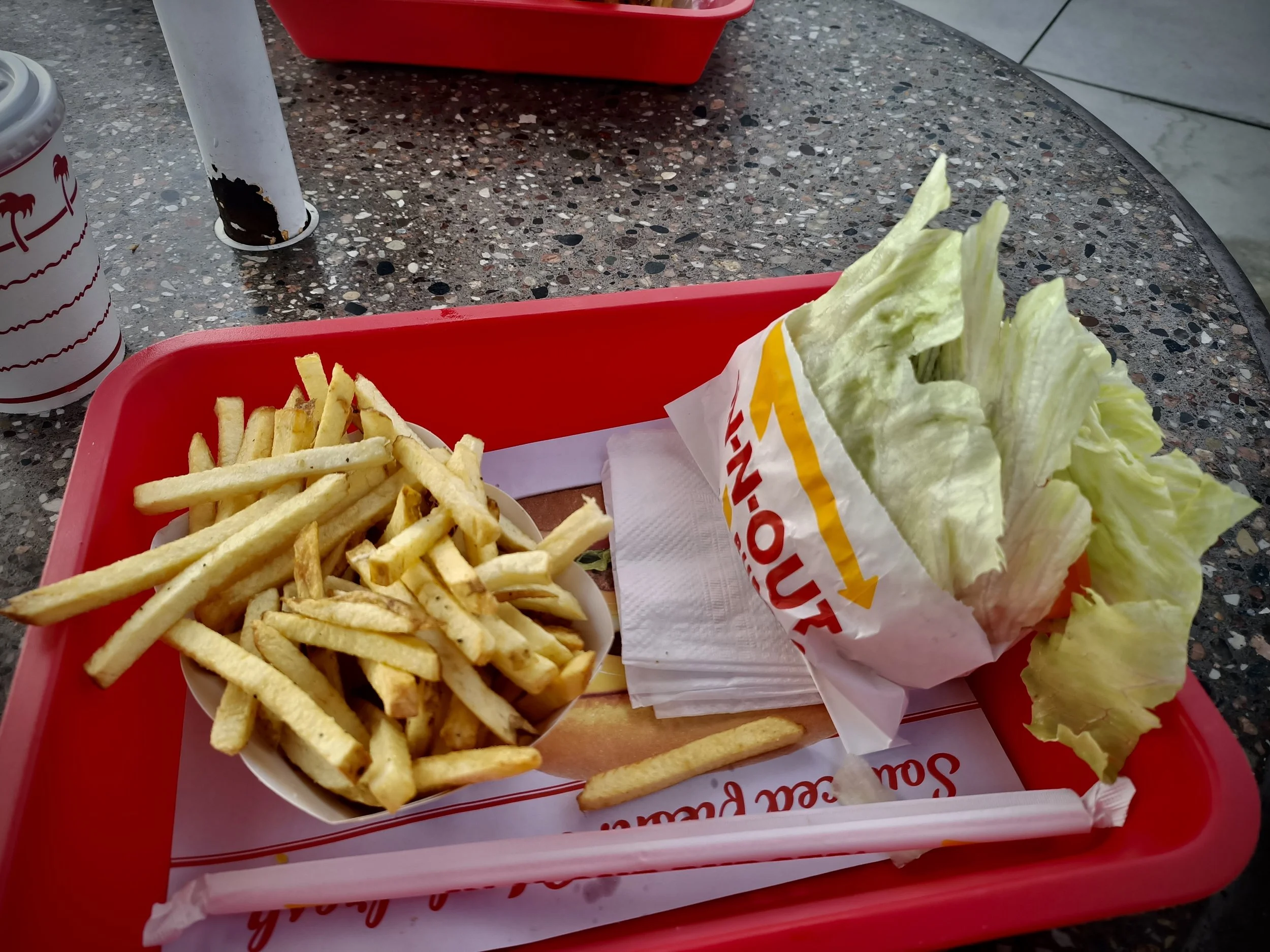 In terms of taste, the protein-style burger is very good. Though it is very unhandy to eat with your hands. Nothing on the burger is ever well situated. All the chilies are waiting for you in one spot, so your mouth will be on fire forever. Therefore, my preference is to eat the burger at home with a plate underneath it and some cutlery (I know this sounds awful but to me, it is way tastier this way!). The fries are not my style, but I am Dutch, so I normally eat thick fries, freshly pealed and then fried. However, I must say that I am so happy that I am able to order fries. Most of the time, this is not an option. So even though I think they could be better, I will still order them every time I go to one of the many In-N-Out locations in California. Furthermore, there has been some debate about the sauce, whether it is gluten-free or not. I tried it several times and was okay afterwards. The ingredients don’t mention gluten so I would say it is safe to eat! I think the taste of the sauce is great (despite it being fairly salty).