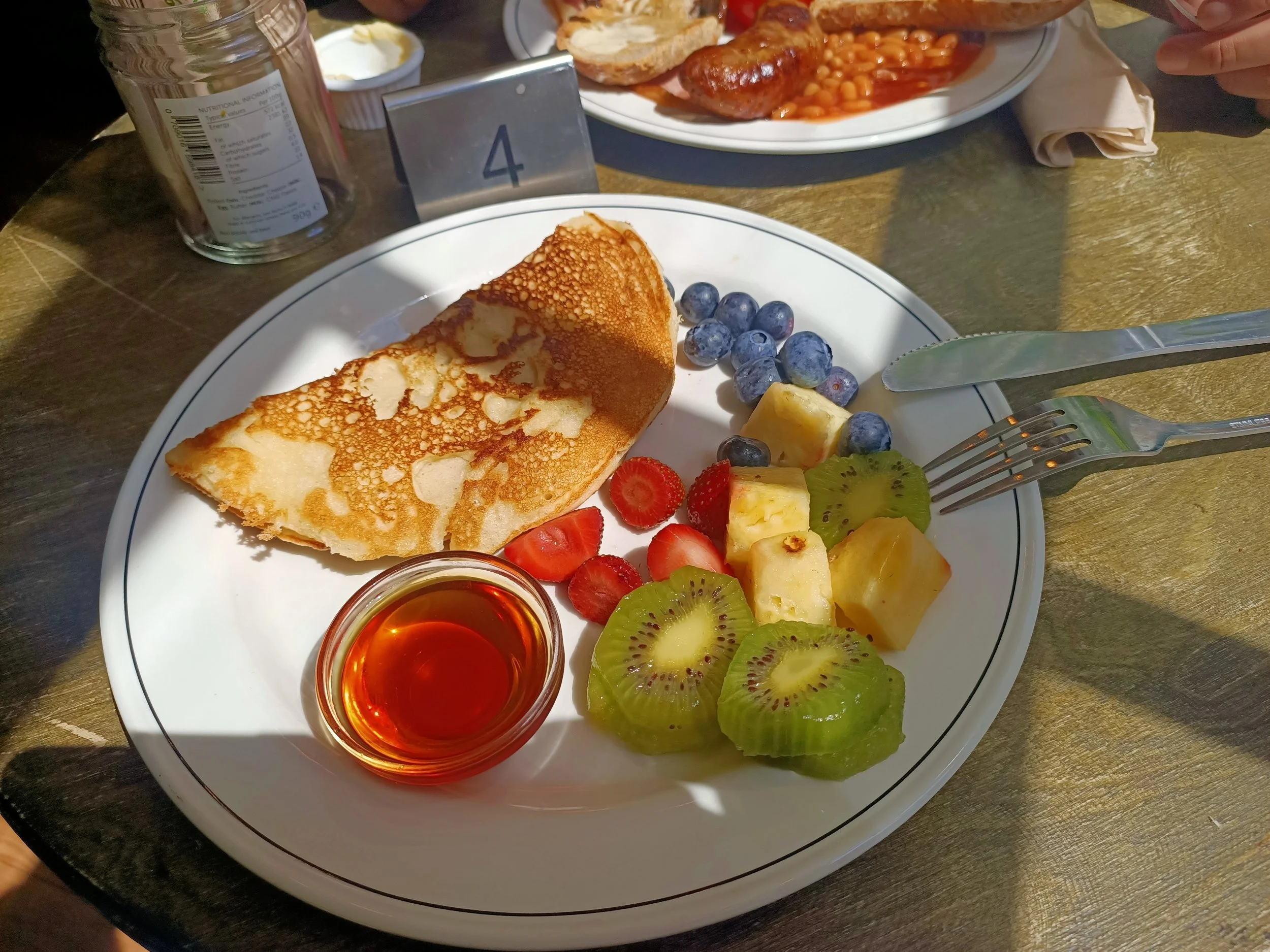 In this cute, centrally located café in Oxford I had a late breakfast. The sun was breaking through and shining nicely on the table where I was sitting. It had been cold in Oxford! I ordered the gluten-free pancake since I was craving some sweetness and nothing too heavy on the stomach. My eating partner in crime had an English breakfast that they could also prepare gluten-free. The pancake is folded, so it is bigger than it looks down here in the photo, and it was tasty. Fluffy, light and delicious, as well as the fresh fruits. The fruits were organic and very tasty, not the occasional fruits that sometimes end up on your plate while they are not yet ripe, sour and still too tough to eat. A perfect breakfast and everyone that worked here was very kind and helpful!