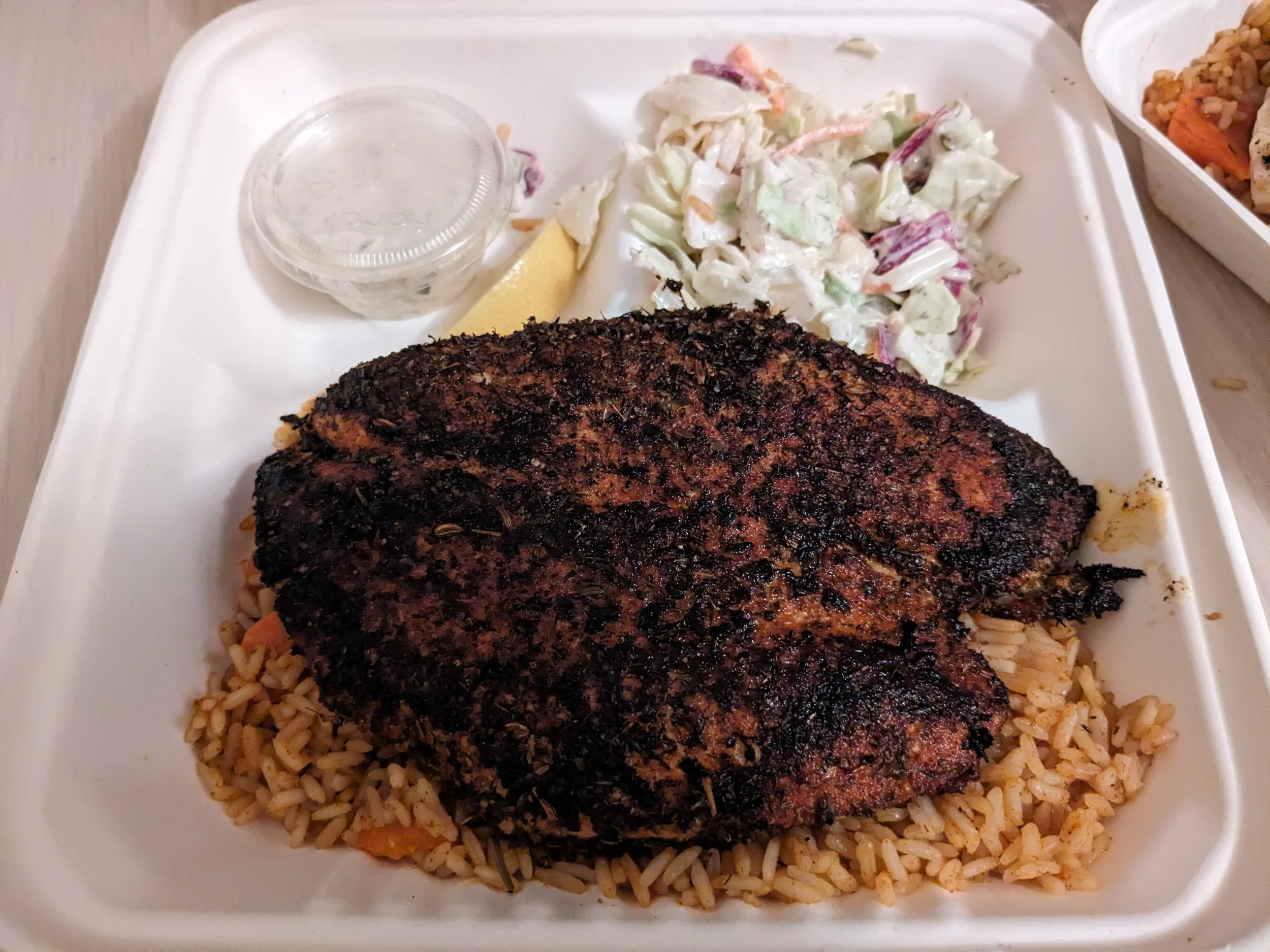 I ordered the salmon, blackened, and with Cajun rice. The fresh catch plates also come with hand-cut crunchy coleslaw and fresh tartar sauce.